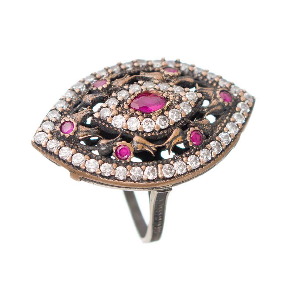 Anel Joia Turca Navete é confeccionado em prata 925, possui banho em bronze, os detalhes levam zircônias brancas e pedras naturais rubis.