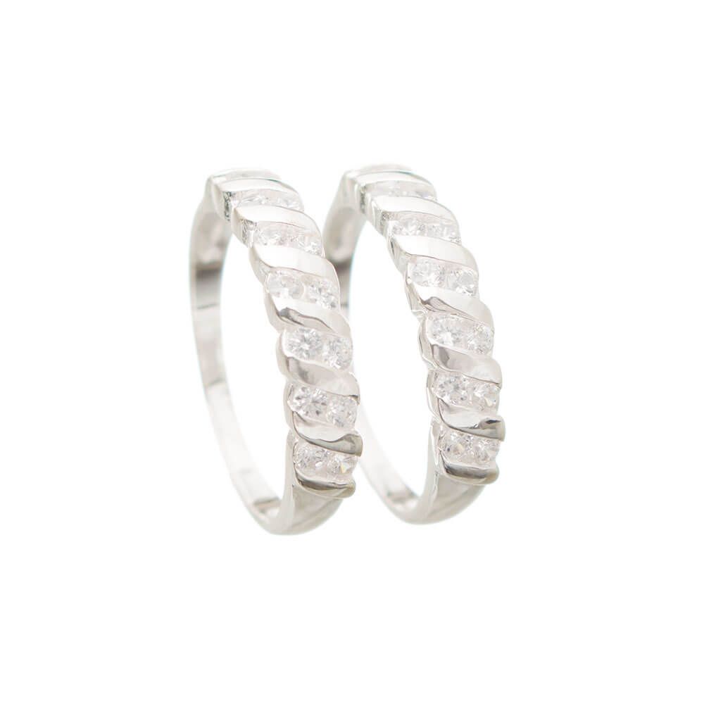 Aparador Aliança Prata Torcido possui cravação de zircônias baguetes brancas em seu topo.