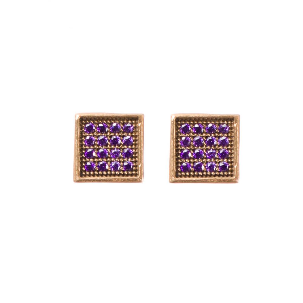 Confeccinado em prata 925 com detalhes em bronze, o Brinco Joia Turca Pavê é um quadradinho com cravação pavê de zircônias lilás e possui desenhos vazados na prata na sua face posterior.