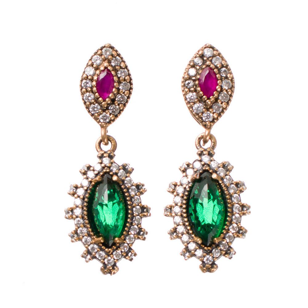 Confeccionado em prata 925, o Brinco Joia Turca Prata possui detalhes com banho em bronze, pedras naturais nas cores rubi e verde e zircônias brancas. O Brinco Joia Turca Prata possui desenhos vazados na prata em sua face posterior.