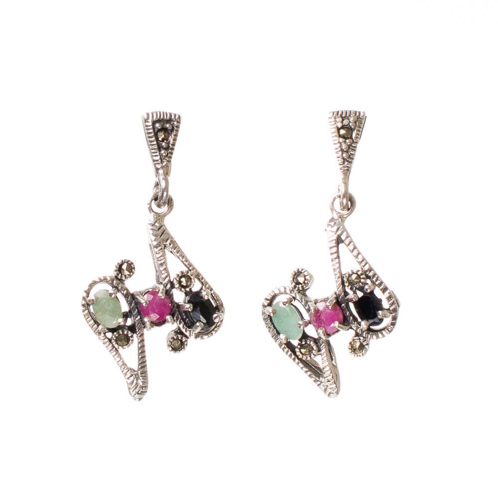 Confeccionado em prata 925, o Brinco Prata de Bali possui detalhes envelhecidos, desenhos na prata e pedras esmeralda, rubi, safira e marcassitas.